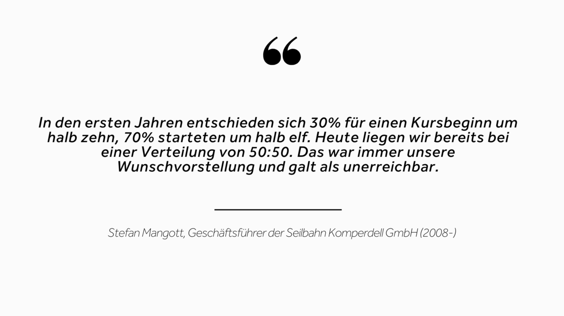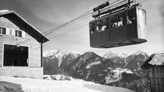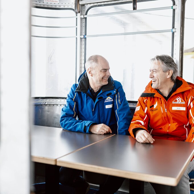 „Wir sitzen hier in einer der zwei originalen Kabinen der Pendelbahn Serfaus-Komperdell. 1958 wurde sie in Betrieb genommen. Die zweite Kabine hängt zur Erinnerung an der Außenwand des Starrest, genau an der Stelle, wo die Originaleinfahrt der Bahn war. Am Holzbahnsteig sitzen heute die Skischulkinder", erzählt Stefan, der seit 2008 Geschäftsführer der Serfauser Bergbahnen ist.