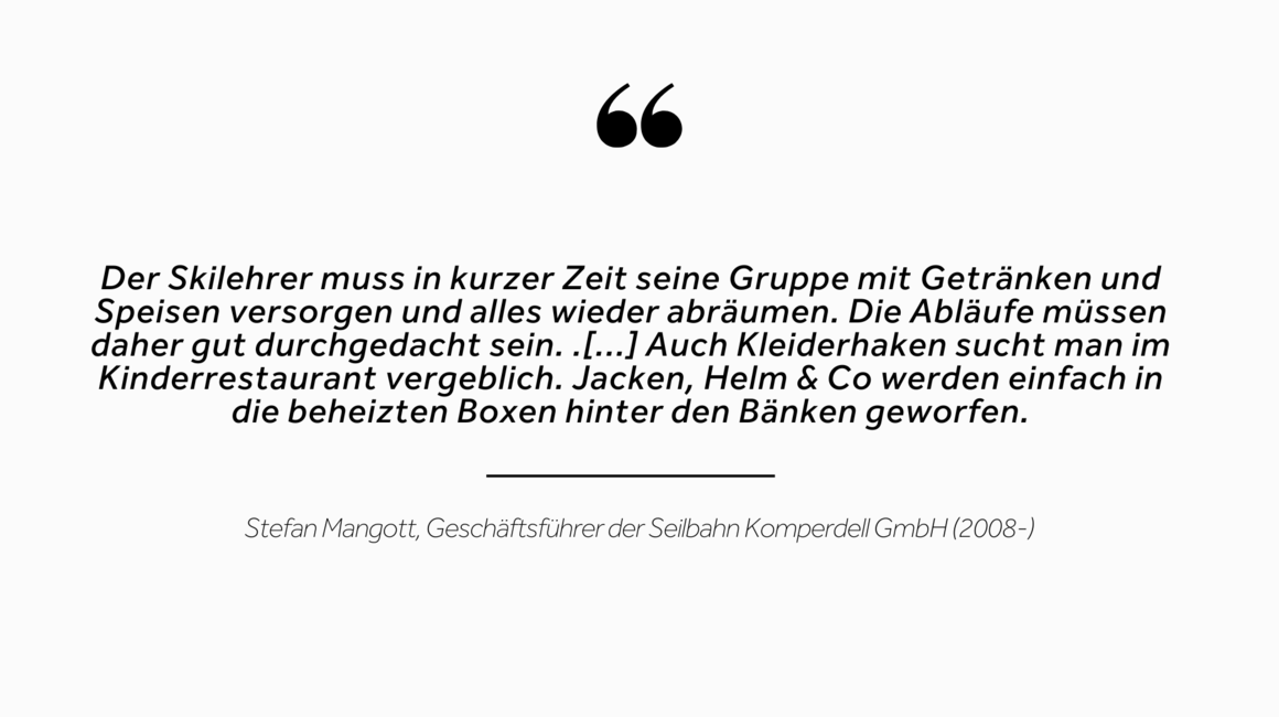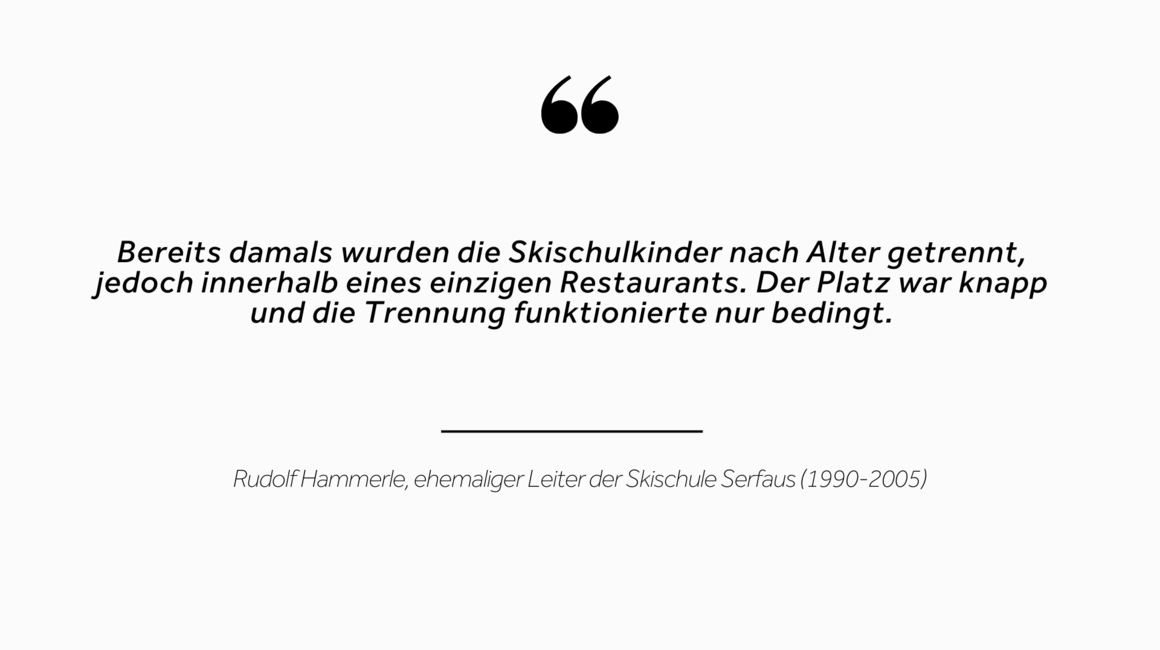 Serfaus verstand also schon früh, dass Kinder im Winterurlaub auch während der Mittagspause eine optimale Betreuung benötigen. Auch wenn das erste Kinderrestaurant für die damalige Zeit funktionell sehr gut war, so gab es aber Nachteile. „Bereits damals wurden die Skischulkinder nach Alter getrennt, jedoch innerhalb eines einzigen Restaurants. Der Platz war knapp und die Trennung funktionierte nur bedingt. Die große Anzahl an Kindern, die alle zur gleichen Zeit ihre Mittagspause verbrachten, war nur schwer zu bewältigen. Zudem gab es auch noch keine kindgerechten Tische oder Toiletten. Heute kaum vorstellbar“, erzählt Rudl.