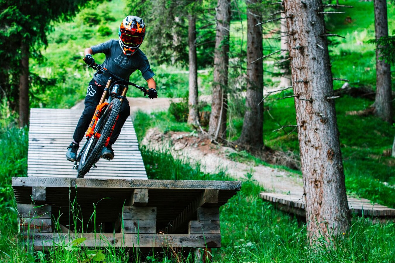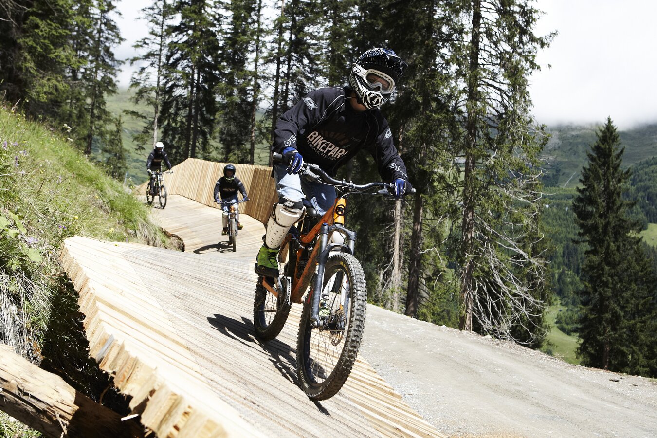 Eine Helmpflicht gilt auf allen unseren Trails. Ein Fullface-Helm und Knieschützer sind zudem Voraussetzung für das Befahren der Bikeparktrails. Hier appellieren wir an die Eltern der Kids, die mit gutem Vorbild vorangehen sollen. Als Skilehrer hat mich ein Gast sogar einmal gefragt, ob er nun ohne Helm fahren kann: „Ich fahre ja nun schon seit 10 Jahren.“ Was für ein Trugschluss. Das Tragen eines Helmes ist sowohl beim Skifahren als auch beim Biken zu jeder Zeit ein klares Muss. Auch beim Bergauffahren müsst ihr eure Köpfe durch einen Helm schützen, da ein Downhiller von oben auch Fehler machen kann. Außerdem empfehle ich allen Action- als auch Genuss-Bikern, Handschuhe zu tragen. Außerhalb des Bikeparks kann auch ein Halbschalen-Helm getragen werden.