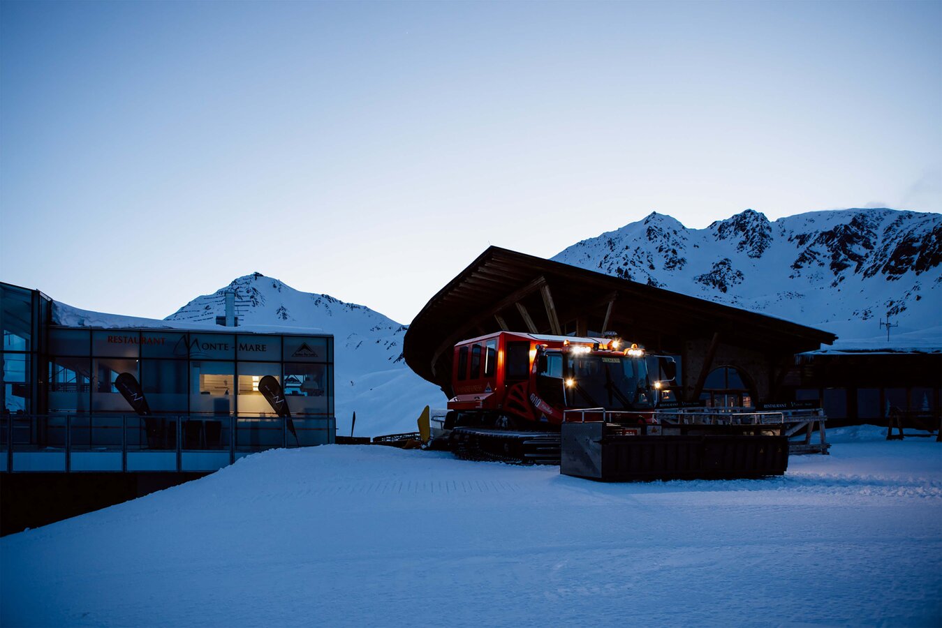 „Sie haben einen Traumjob, sagen Gäste oft zu mir. Dann tauschen wir sofort, antworte ich dann immer. Ich nehme deine Ski und du meine Maschine!“, lacht Elmar. Aber ganz unrecht haben sie nicht, diejenigen, die vom Traumjob sprechen – vor allem, wenn sich das Wetter wie bei unserem Treffen von seiner allerschönsten Seite zeigt. Blitzblauer Himmel, viel frischer Schnee und ein fast schon unwirklich schönes Panorama machen die Fahrt zu einem außergewöhnlichen Erlebnis. Auf der Retourfahrt abends nach dem Sunset Dinner Masner ist es längst dunkel, nur die Lichtkegel der anderen Pistenraupen sind wie einsame Tänzer auf den Berghängen ringsum zu sehen. Im Schnee lassen sich Spuren entdecken: Rehe, die sich in der Stille der Nacht auf Futtersuche machen. „Schneehasen, Schneewiesel, Schneehühner, ich habe alle schon beobachtet“, erzählt er.