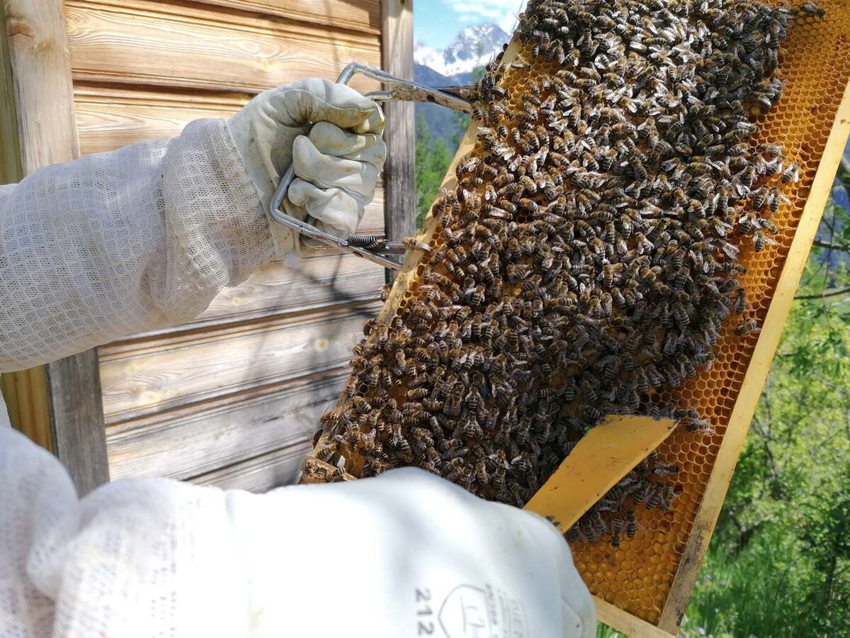 Der Aufwand für ein Glas Honig ist wirklich beträchtlich und das Imkern eine wahre Wissenschaft. So ganz ungefährlich ist diese Leidenschaft aber nicht. Dementsprechend gut ausgerüstet und geschützt geht ein Imker an sein Werk. Bei meinem Besuch bei Alfred bekomme auch ich einen Arbeitsmantel mit Tüllhut und dicke Handschuhe. Auch wenn mein Herz trotz Schutzkleidung plötzlich ein wenig schneller zu schlagen beginnt, nehme ich meinen ganzen Mut zusammen und folge Alfred unauffällig vom Inneren der Holzhütte zu den zahlreichen Bienenstöcken. Mehr als ein Dutzend Völker sind hier in Fiss zuhause. Mit einem Freund betreut Alfred die Bienen hier. Etwa einmal pro Woche besucht er seine Insekten. Das Summen der Carnica-Bienen ist unüberhörbar. Während Alfred mir erzählt, dass ein Volk etwa 60.000 Bienen zählt, versuche ich, mich auf seine Stimme zu konzentrieren und die wuselnden Bienen um mich herum ein wenig auszublenden. Ich bin von den emsigen Tierchen derart fasziniert, dass in wenigen Sekunden gar kein Platz für Angst bleibt.