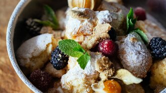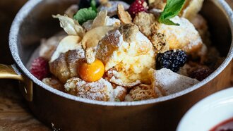 Zum Abschluss verrät dir Mathias noch sein Geheimrezept für einen wahren Klassiker in der österreichischen Küche: den Kaiserschmarren. Er schmeckt eigentlich immer – ob als Hauptspeise oder als himmlisches Dessert. Wie magst du ihn am liebsten? Bis das Schlosshotel Fiss wieder seine Pforten öffnet und dich mit einem kaiserlichen Schmarren verwöhnt, zaubere ihn doch einfach bei dir zuhause. Mathias zeigt dir wie. Weiterlesen lohnt sich also!