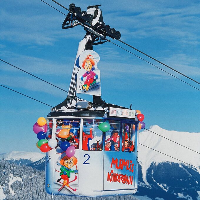 „In den letzten drei Jahrzehnten ist einiges entstanden, auf das ich stolz bin: das spaßige Murmliwasser, der hochalpine Murmeltiersteig oder die Kabinen der unterirdischen Luftkissenbahn mit bunten Zeichnungen von mir. Eine besonders große Ehre war es, als eine Seilbahn nach mir benannt wurde: die Murmlibahn. Die alte Pendelbahn mit ihren zwei Kabinen wurde 1973 in Betrieb genommen und 1988 durch eine Umlaufseilbahn ersetzt. Mittlerweile ist diese auch wieder Schnee von gestern. Die aktuelle Komperdellbahn ist nun hochmodern. Jetzt bin ich aber etwas abgeschweift… Die Seilbahngeschichte interessiert mich einfach sehr. Was ich aber erzählen wollte: 1996 wurde mir eine der zwei Pendelkabinen gewidmet. Das war für die Skischulkinder und auch für mich richtig cool“, strahlt Murmli.