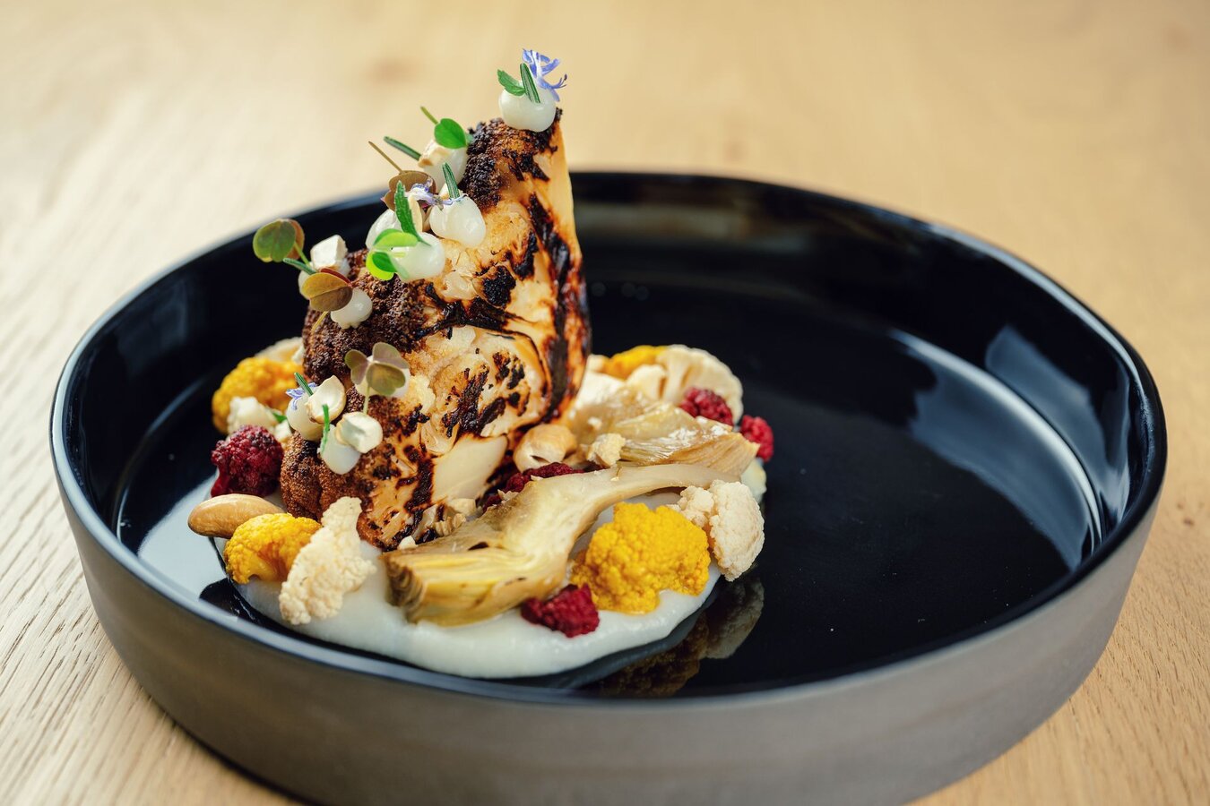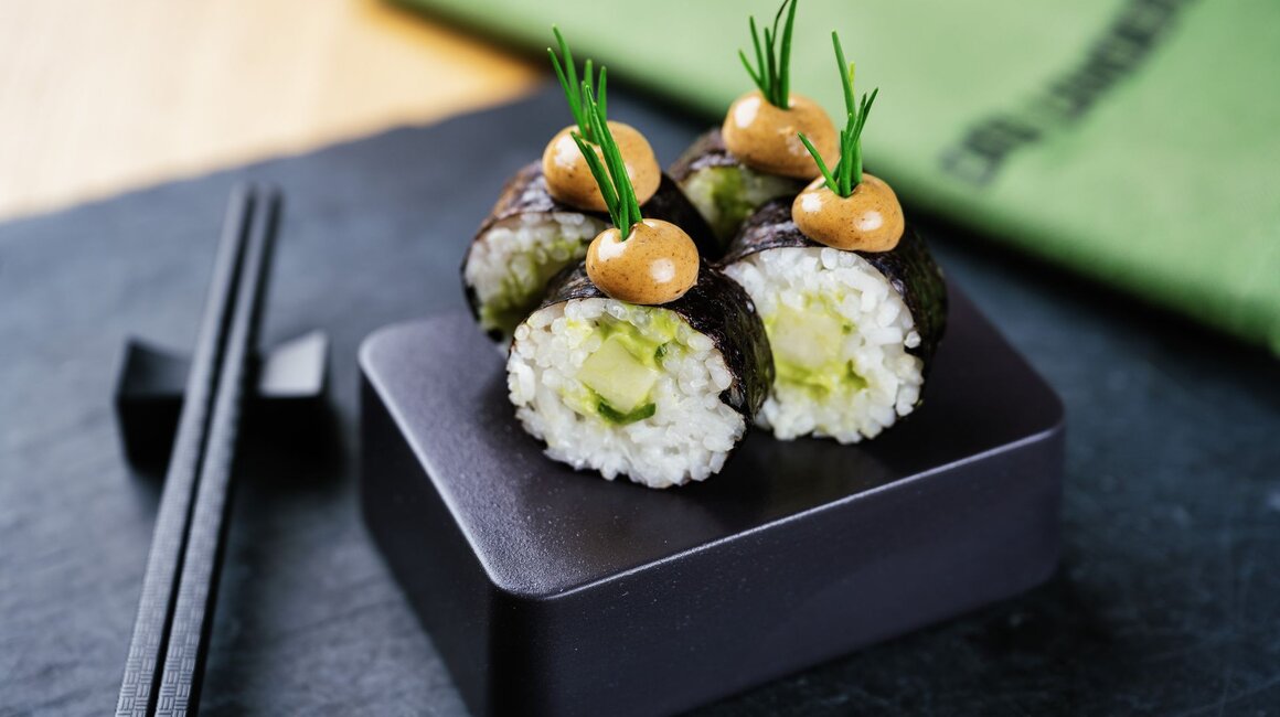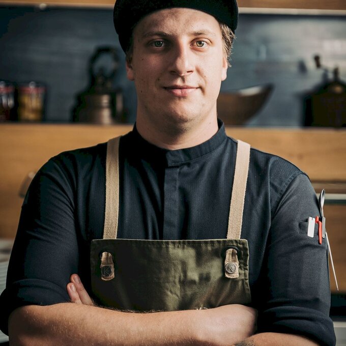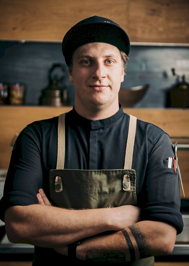 „Zu Beginn bekommen alle Gäste zwei Grüße aus der Küche. Das VERSCHAFFT MIR ZEIT, ich bin ja nur alleine in der Küche. Die Grüße haben bisher jedem geschmeckt. Einige Gäste muss ich zu Beginn aber davon überzeugen, dass ich sie nicht abwandeln kann. Es wird ja ALLES FRISCH zubereitet, da steckt gutes Zeitmanagement dahinter. Am Ende sind dann immer alle zufrieden. Viele sind Wiederholungstäter. Darunter erfreulicherweise zahlreiche Einheimische. Zuerst reiche ich BROT MIT BUTTER, alles natürlich selbstgemacht. Statt tierischer Butter kann ich pflanzlichen Humus anbieten. Dann folgt ein komplett veganer Gruß. Derzeit überrasche ich sie mit SUSHI mit fermentierter Knoblauchmayonnaise, Kohlrabi, Avocado und Gurke. Ich will einfach immer etwas machen, was sonst noch keiner gemacht hat. Vorbilder hab ich nicht wirklich. Ich kopiere niemanden, sondern bin EINFACH ICH und ständig auf der Suche nach neuen Geschmäckern und Gerichten.“