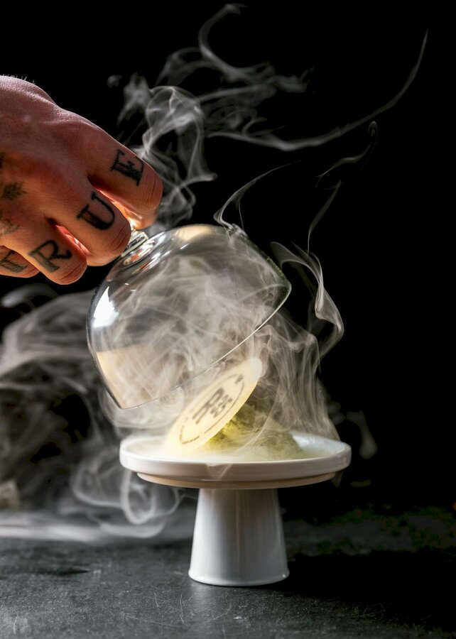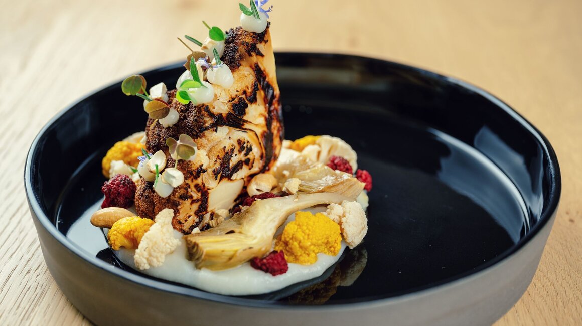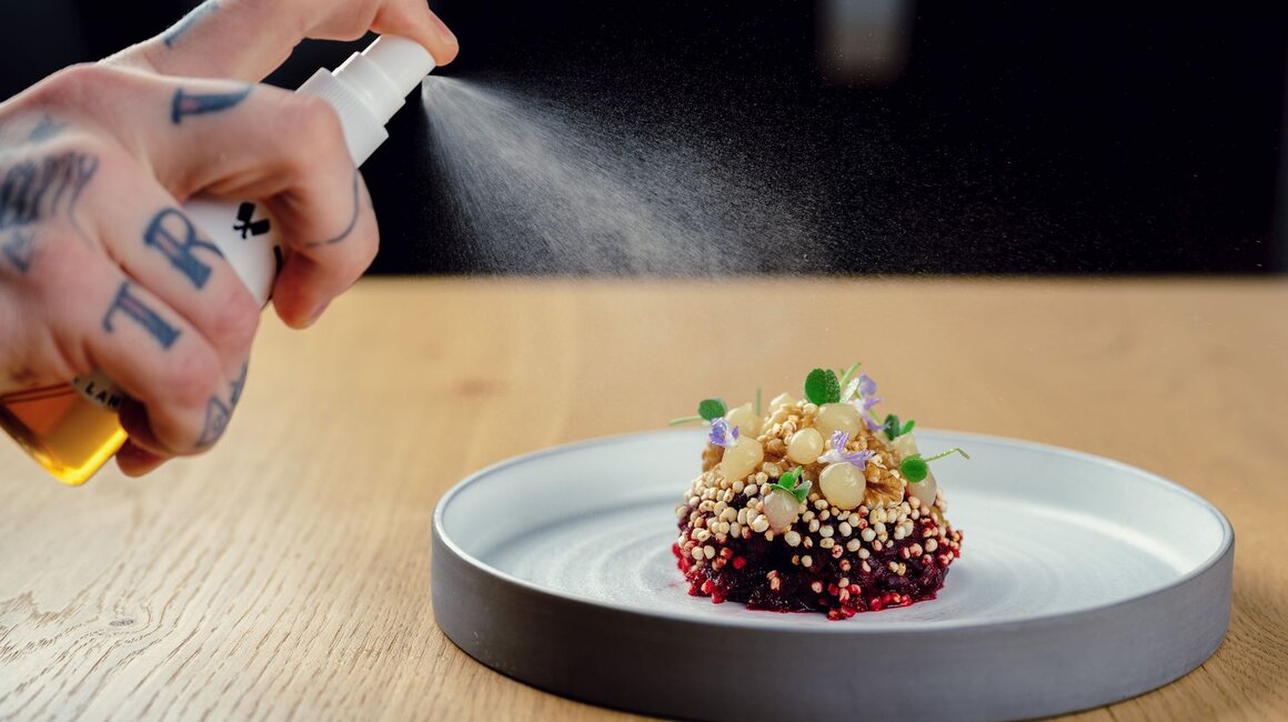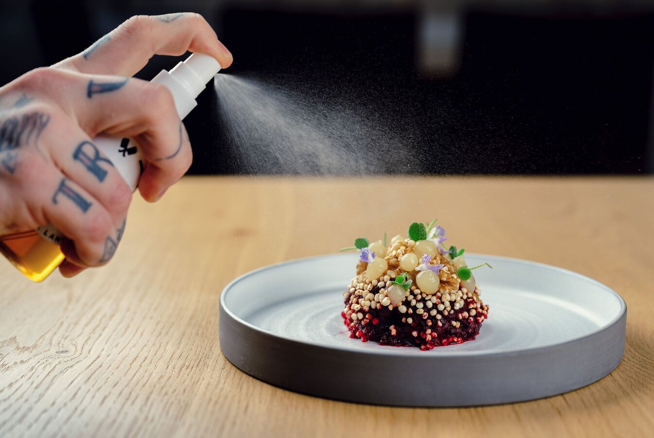 „Zu Beginn bekommen alle Gäste zwei Grüße aus der Küche. Das VERSCHAFFT MIR ZEIT, ich bin ja nur alleine in der Küche. Die Grüße haben bisher jedem geschmeckt. Einige Gäste muss ich zu Beginn aber davon überzeugen, dass ich sie nicht abwandeln kann. Es wird ja ALLES FRISCH zubereitet, da steckt gutes Zeitmanagement dahinter. Am Ende sind dann immer alle zufrieden. Viele sind Wiederholungstäter. Darunter erfreulicherweise zahlreiche Einheimische. Zuerst reiche ich BROT MIT BUTTER, alles natürlich selbstgemacht. Statt tierischer Butter kann ich pflanzlichen Humus anbieten. Dann folgt ein komplett veganer Gruß. Derzeit überrasche ich sie mit SUSHI mit fermentierter Knoblauchmayonnaise, Kohlrabi, Avocado und Gurke. Ich will einfach immer etwas machen, was sonst noch keiner gemacht hat. Vorbilder hab ich nicht wirklich. Ich kopiere niemanden, sondern bin EINFACH ICH und ständig auf der Suche nach neuen Geschmäckern und Gerichten.“