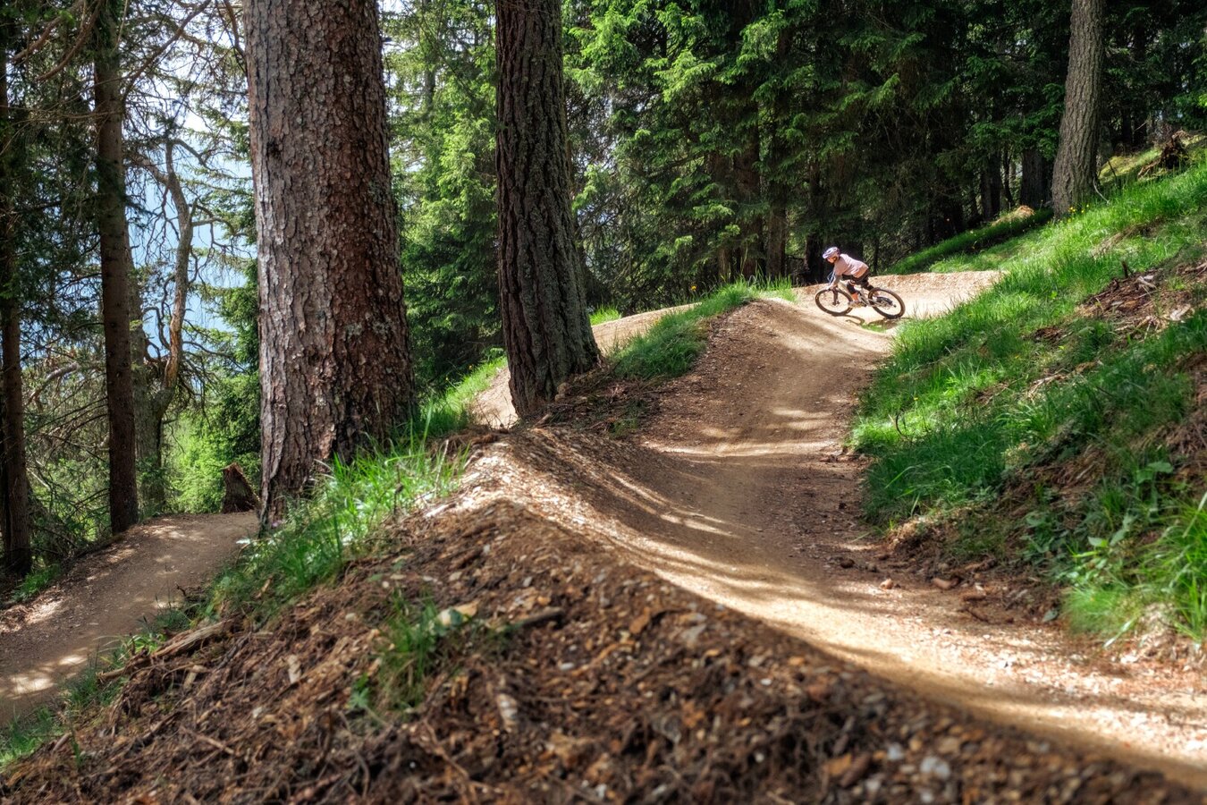 Der Trail startet mit einer Kombination aus kleinen Wellen und einfachen Kurven. Sehr verspielt und mit vielen Anliegerkurven führt der Trail weiter durch Bergwiesen und alte Wälder. Im letzten Abschnitt sorgen Northshore-Elemente, Wellen und Kurven für Abwechslung. Alle Elemente sind einsteigerfreundlich und lassen sich problemlos überrollen. Auf dem flowigen Trail kann man wunderbar erste MTB-Luft schnuppern.