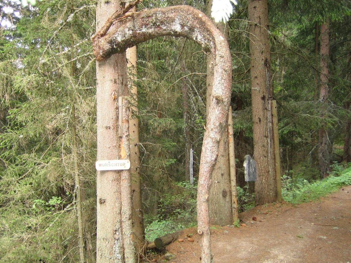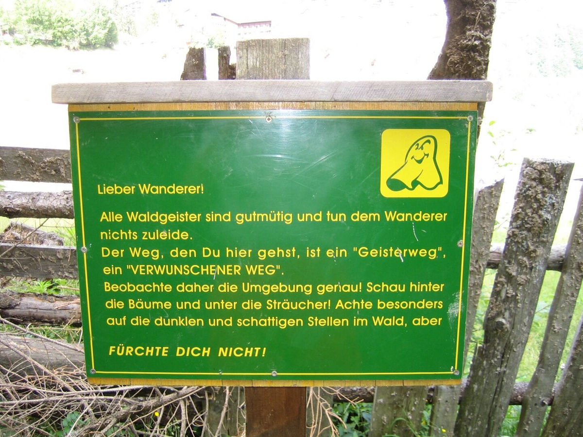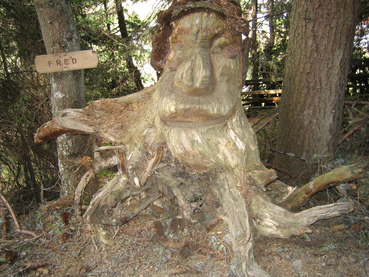 „Der Wald als Märchenbuch!“ In Baumstrünke und Rinden geschnitzte Geistergesichter, mystische Figuren und Gestalten geben diesem Weg etwas Geisterhaftes, an dem nicht nur kindliche Gemüter ihren Spaß haben.