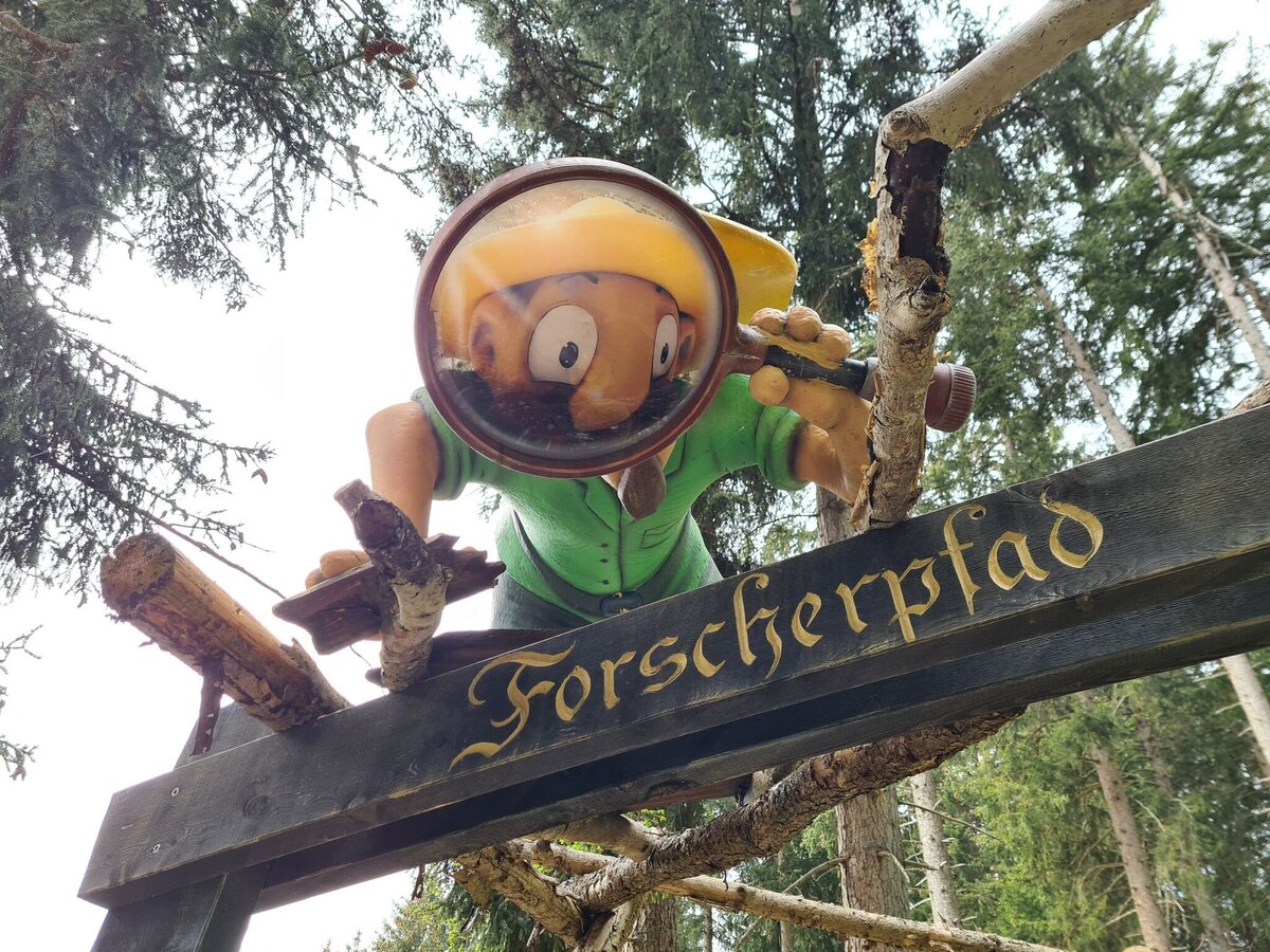 Der Forscherpfad verbindet ohne großen Höhenunterschied den Wasserwandersteig mit dem Faltriweg 34. Er verläuft größtenteils im Wald. Kunstvolle Figuren sorgen für mancherlei Überraschung und besonders im Riesenbaumhaus gibt es Vieles zu erforschen und zu entdecken. Dafür heißt es aber: Augen auf!