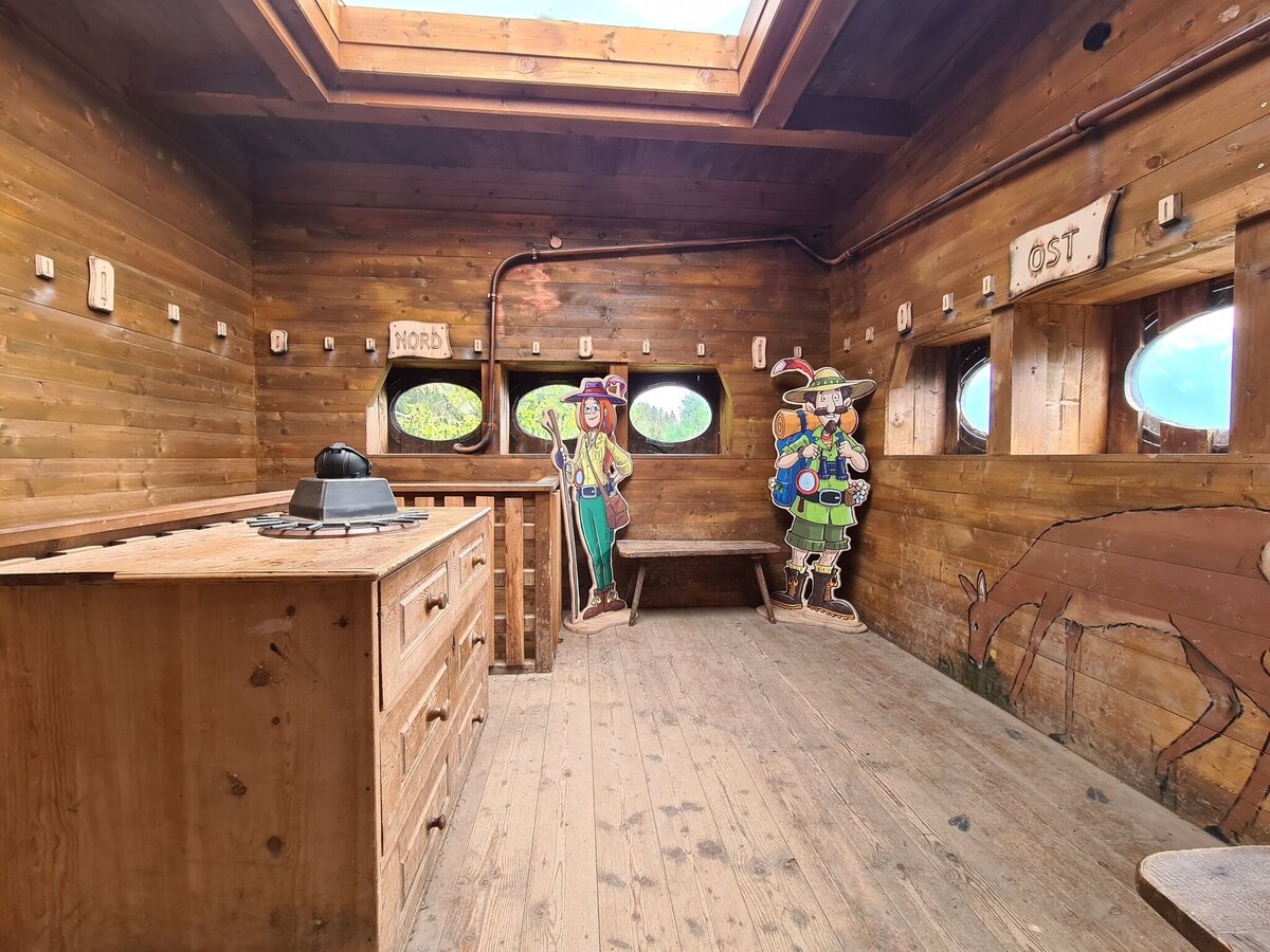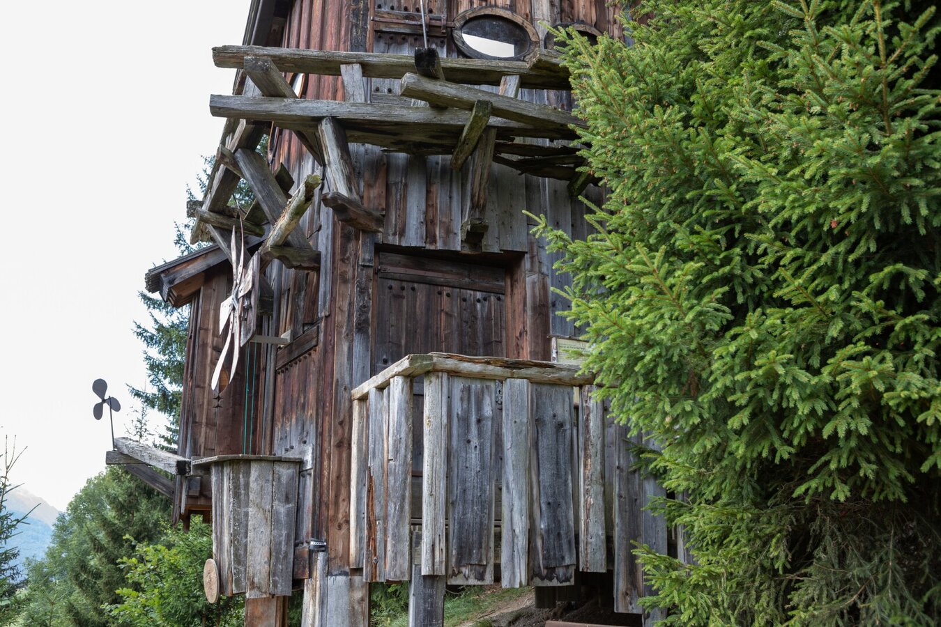 Entlang des Wasserwandersteiges bis zur Tuffgrotte oder von der Villa (L016) auf demselben hinunter. Von unten kommend zweigt man vom Wasserwandersteig nach links ab (L011) und findet bald die ersten Überraschungen. Einem alten Holzweg folgt man kurz nach links unten, um bei den Riesenschnecken wieder nach rechts abzubiegen. Eine Überraschung folgt der anderen, besonders das mehrstöckige Baumhaus lädt Eltern und Kinder zur Fortsetzung der Experimente des Forschers ein. Kurz nach der Bärenhöhle erreicht man den Faltriweg 34, auf dem man gemütlich zum Weiberkessl und nach Ladis (L006) hinunterwandern kann.