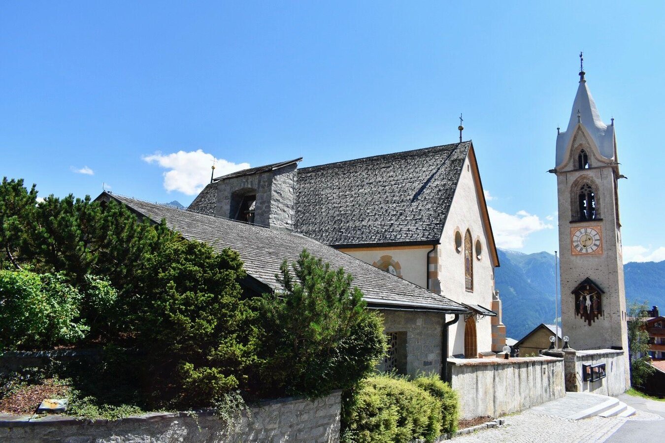 Der Kirchturm ist als sogenannter "Campanille", als freistehender Glockenturm errichtet. Die obere Hälfte wurde um 1500 in gotischen Stil aufgebaut.