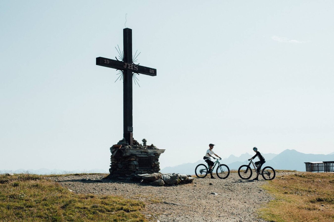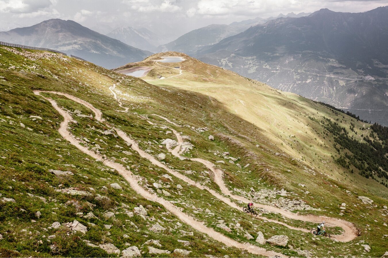 Zunächst geht es erst einmal mit der Schönjochbahn zum Fisser Joch. Von dort sind noch gute 60 hm auf einer Schotterstraße zurückzulegen, um zum Schönjöchl Gipfelkreuz, dem Traileinstieg, zu gelangen. Auf einer Höhe von 2.493 m angekommen, heißt es nun nurmehr Bremsen auf und laufen lassen.