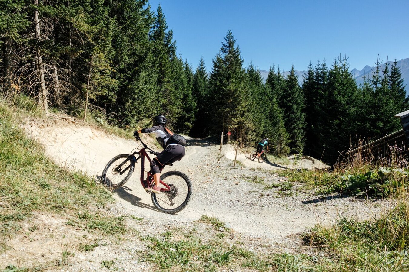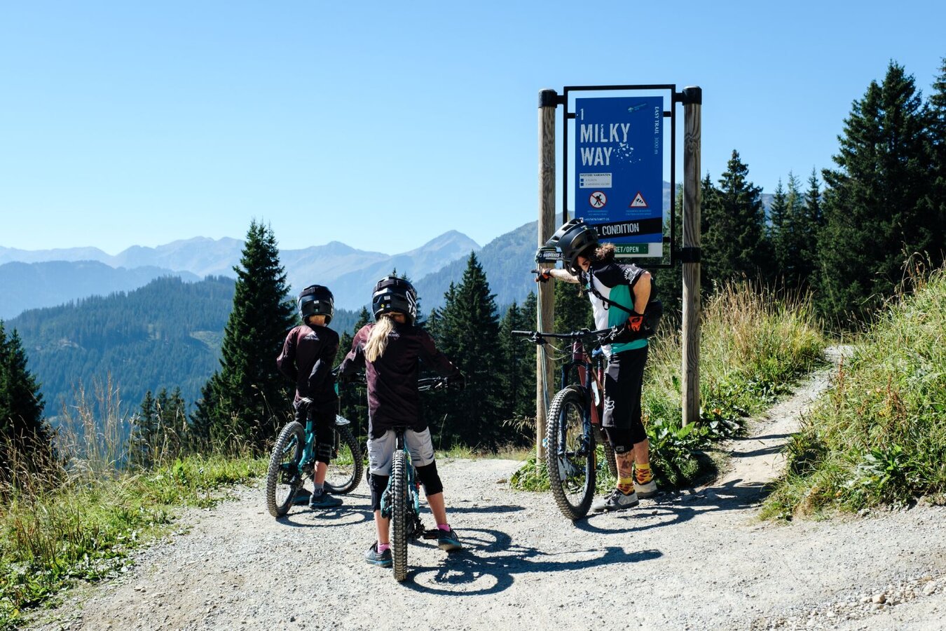 Der Traileinstieg befindet sich auf einer Höhe von 1.840 Metern. Auf dem drei Kilometer langen Bikeparktrail werden etwas mehr als 400 Höhenmeter zurückgelegt. Der Milky Way ist ein einfacher Trail (blau), der vor allem Einsteiger mit wenig Bike-Erfahrung anspricht. Egal welches Tempo und welches Niveau, bei dieser Line steht der Spaß im Vordergrund. Durch seine Beschaffenheit eignet sich der Milky Way ideal für Familien und Mountainbiker, die gerade erste Bikepark- und Trailerfahrungen sammeln. Trotzdem sorgen kleinere Hindernisse für Abwechslung und insbesondere Sprünge und flachere Anliegerkurven für einen Mini-Adrenalinkick. Der Milky Way ist also perfekt, um erste Bikeparkluft zu schnuppern und die ersten Trailkilometer des Tages runterzuspulen.