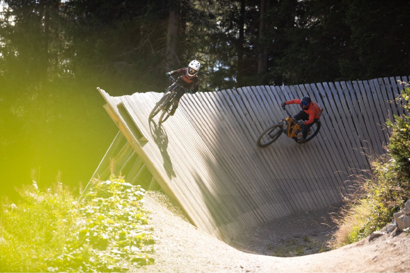 Dir werden die blauen Strecken zu langsam und du bist auf der Suche nach der nächsten Herausforderung? Dann auf zur Strada del Sole, einer der mittelschweren Lines (rot) im Bikepark. Bei der Bergstation der Waldbahn geht es los. Eine Streckenlänge von 2.805 Metern und über vierzig Sprünge bieten Bikepark-Action pur. Wem das zu viel ist, kann den Großteil der Sprünge aber auch ganz simpel überfahren. Ein Wechselspiel von langgezogenen Kurven und Passagen mit vielen kurzen, wendigen Anliegerkurven garantieren einen Ride der Sonderklasse. Zusätzlich dazu sind die North-Shore-Elemente auf der Strada del Sole ein besonderes Extra-Feature. Ein gewisses Maß an Bike-Handling und die Kontrolle über das Rad sind Voraussetzung dafür, die Strada del Sole zu meistern.
