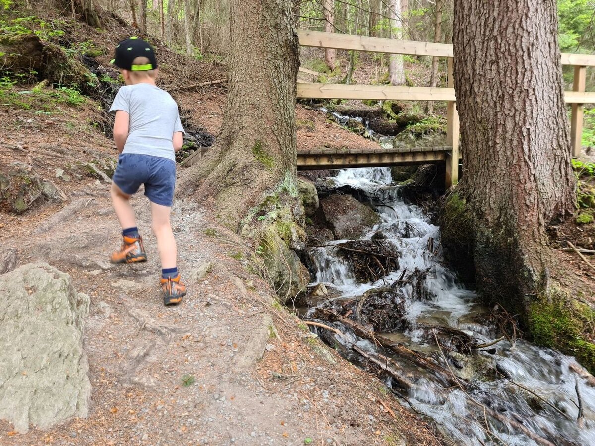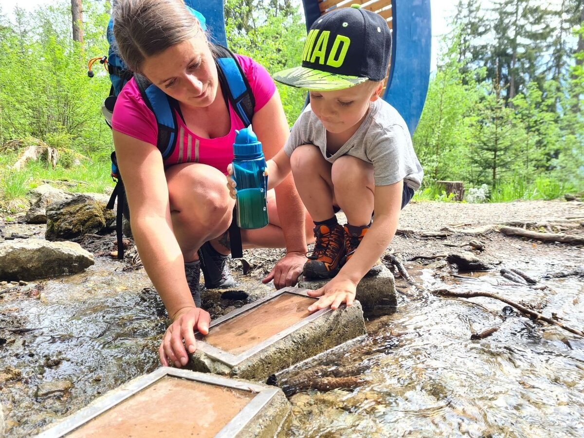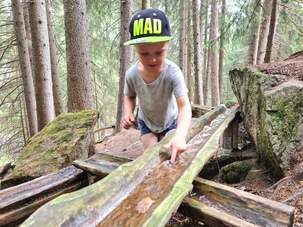 Am Beginn des Weges wird an einem Wasserrad (L007) gezeigt, wie man bereits früher die Kraft des Wassers für Mühlen und Sägen genutzt hat. Weiter geht es über die „Welle“ und zum „Wasservorhang“. Darauf folgen die „Wasserbahnen“ und die neu gestaltete „Riesenquelle“. In der Wasserschleife lädt sie ein „Wassertropfen“ zum Verweilen ein. Horchen Sie auf die Melodie des Wassers, es spielt je nach Lust und Laune – fröhlich, bedächtig oder traurig, genau der Stimmung der zuhörenden Person angepasst. Der vorbeifließende Bach ist das Begleitorchester mit Millionen Wassertropfen als Musikanten. Vorbei am „Fanggaloch“ der Tuffgrotte geht es dann zur Schwefelquelle. Die rote Farbe des Bächleins kommt nicht vom Schwefel, sondern vom hohen Eisengehalt, dadurch kann man das Wasser hier wirklich riechen. Am Ende des Weges befindet sich die Sauerbrunnquelle. In Schriften aus dem Jahre 1571 wird bereits erwähnt, dass Fremde und Fürsten aus Südtirol, der Schweiz und aus Bayern kamen, um die Heilkraft des Wassers zu nutzen. Auch heute wird der „Tiroler Sauerbrunn“ bei Erkrankungen von Niere, Leber, Darm, Magen, Verschleimung der Atemwege, Asthma usw. verwendet. Das Wasser gibt es in Flaschen zu kaufen und kann auch vor Ort beim Brunnen verkostet werden.