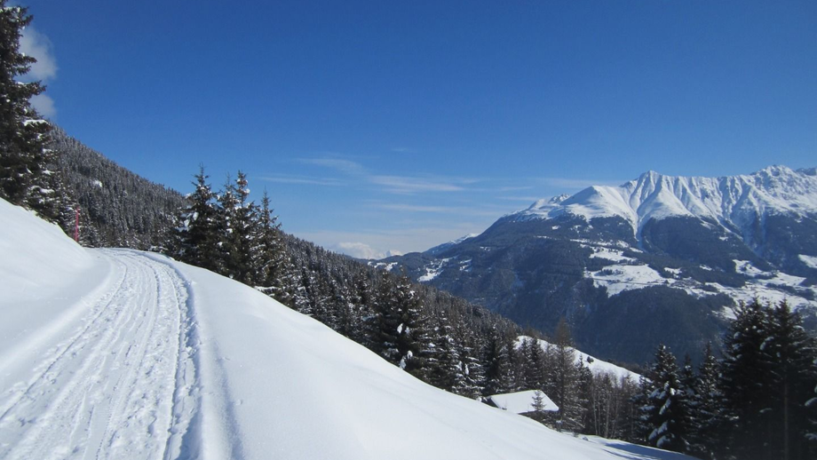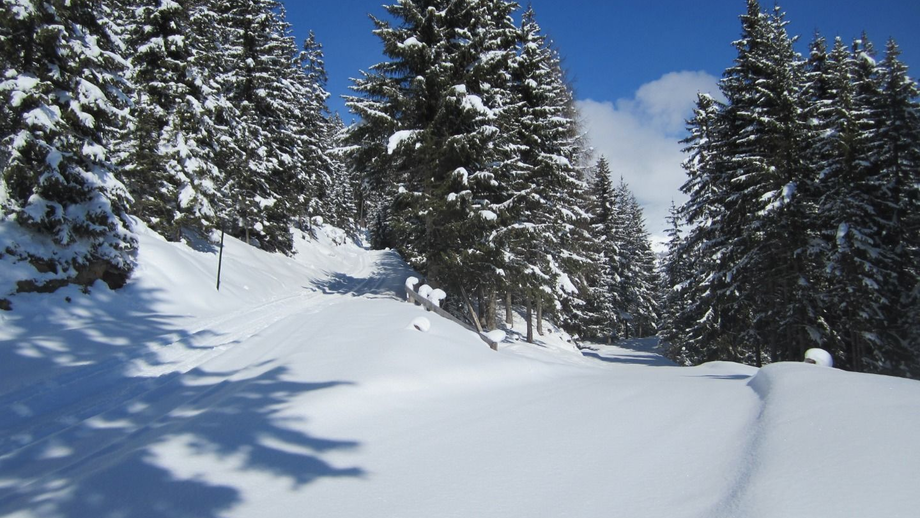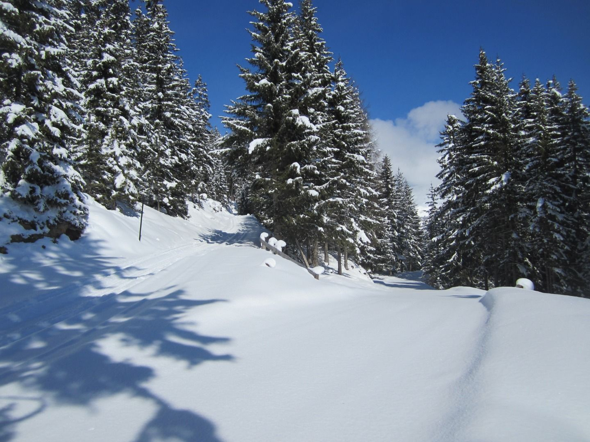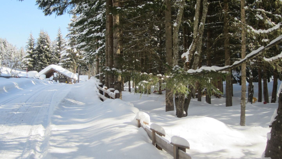 Start ist bei der Fisser Säge (Ende Sägegasse F013), den Anstieg hoch, an Bertas Kindervilla vorbei, parallel der Langlaufroute folgend durch den Winterwald bis zur Schöngampalm.