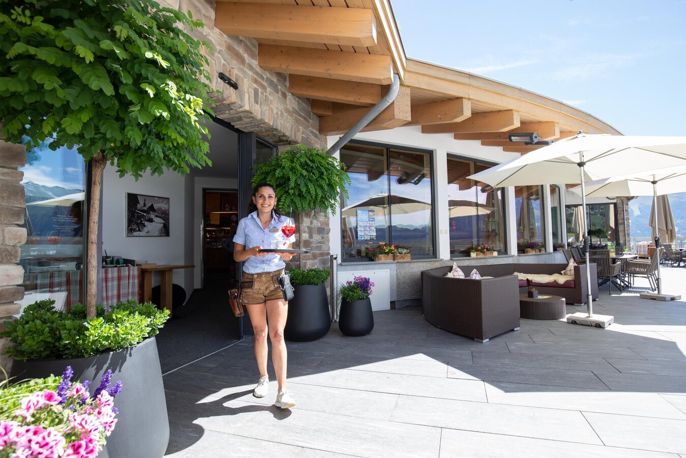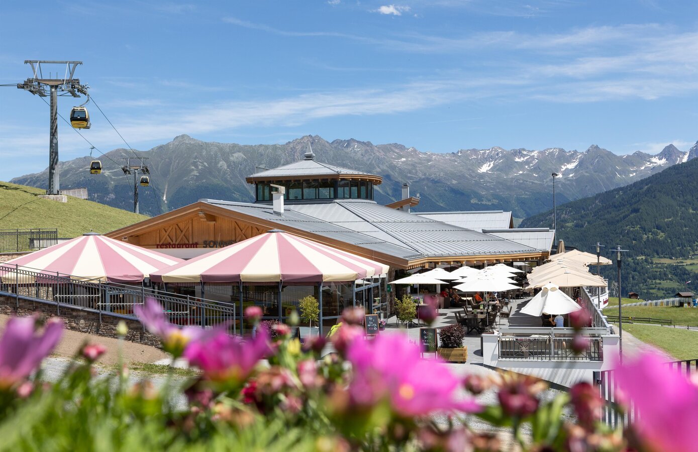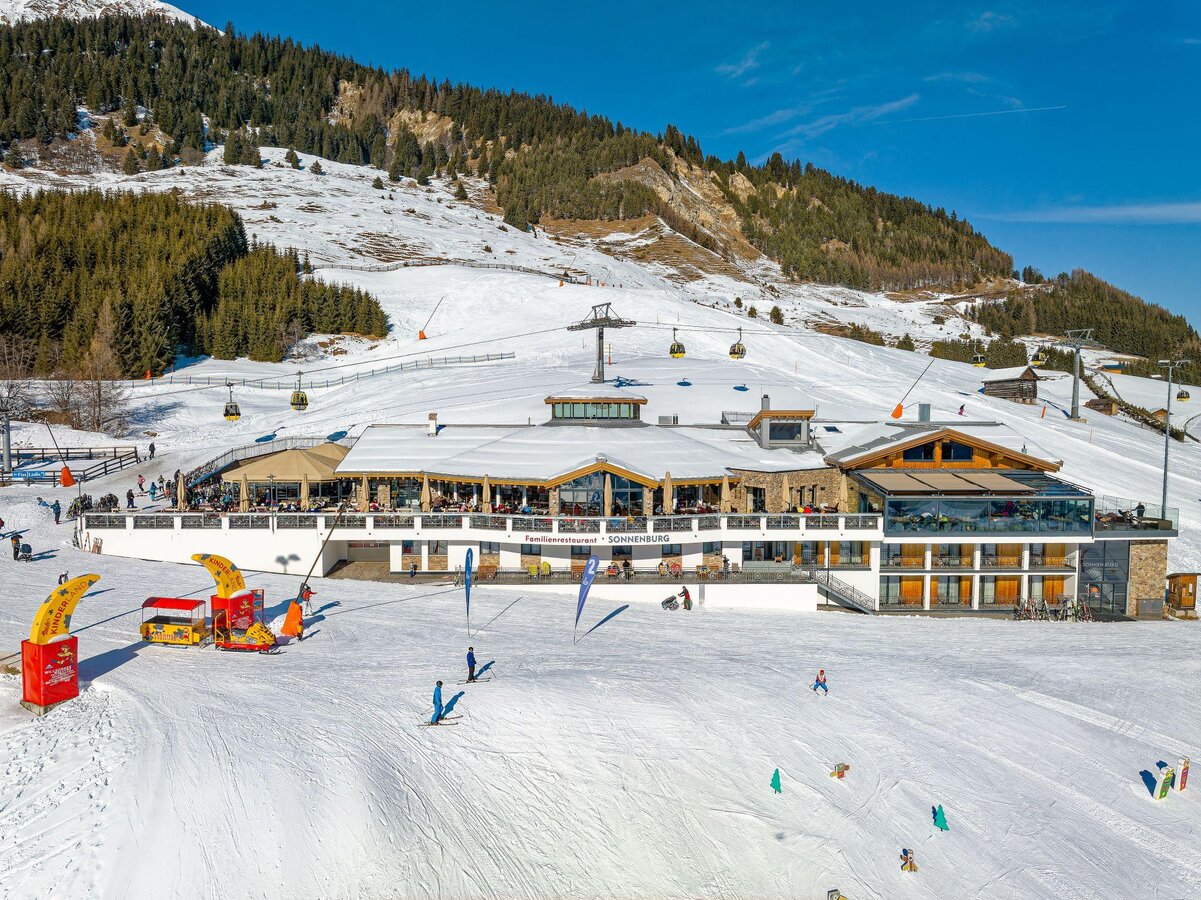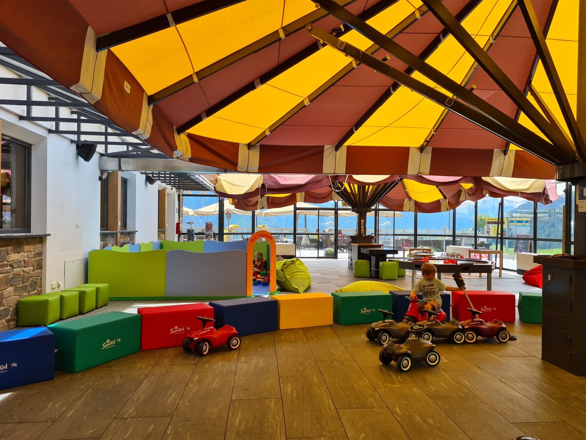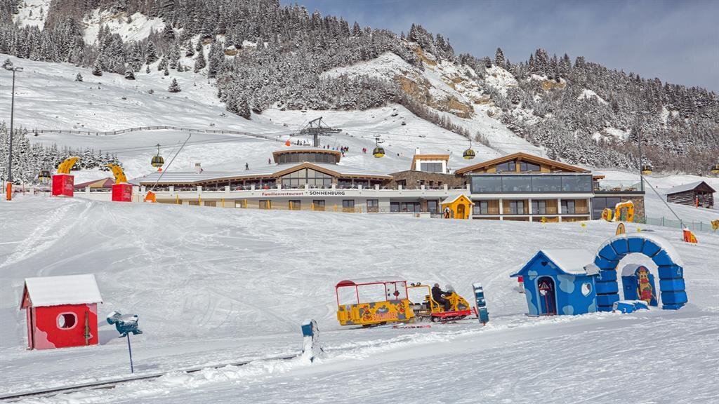 Neu und innovativ: „Bertas Ski TV“ – das Geschehen im Kinderland und im „Kids-Corner“ wird live auf Großbildschirmen ins Restaurant übertragen, sodass die ganze Familie immer dabei sein kann. Eine Rolltreppe führt bequem von Bertas Kinderland direkt in die Sonnenburg.
