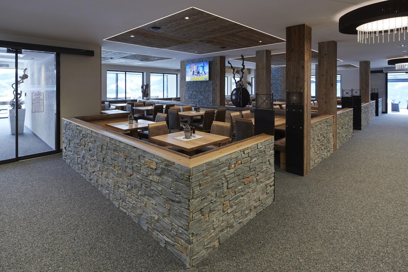 Mit viel Holz und Stein präsentiert sich das Restaurant als gemütlicher Treffpunkt für Groß und Klein.