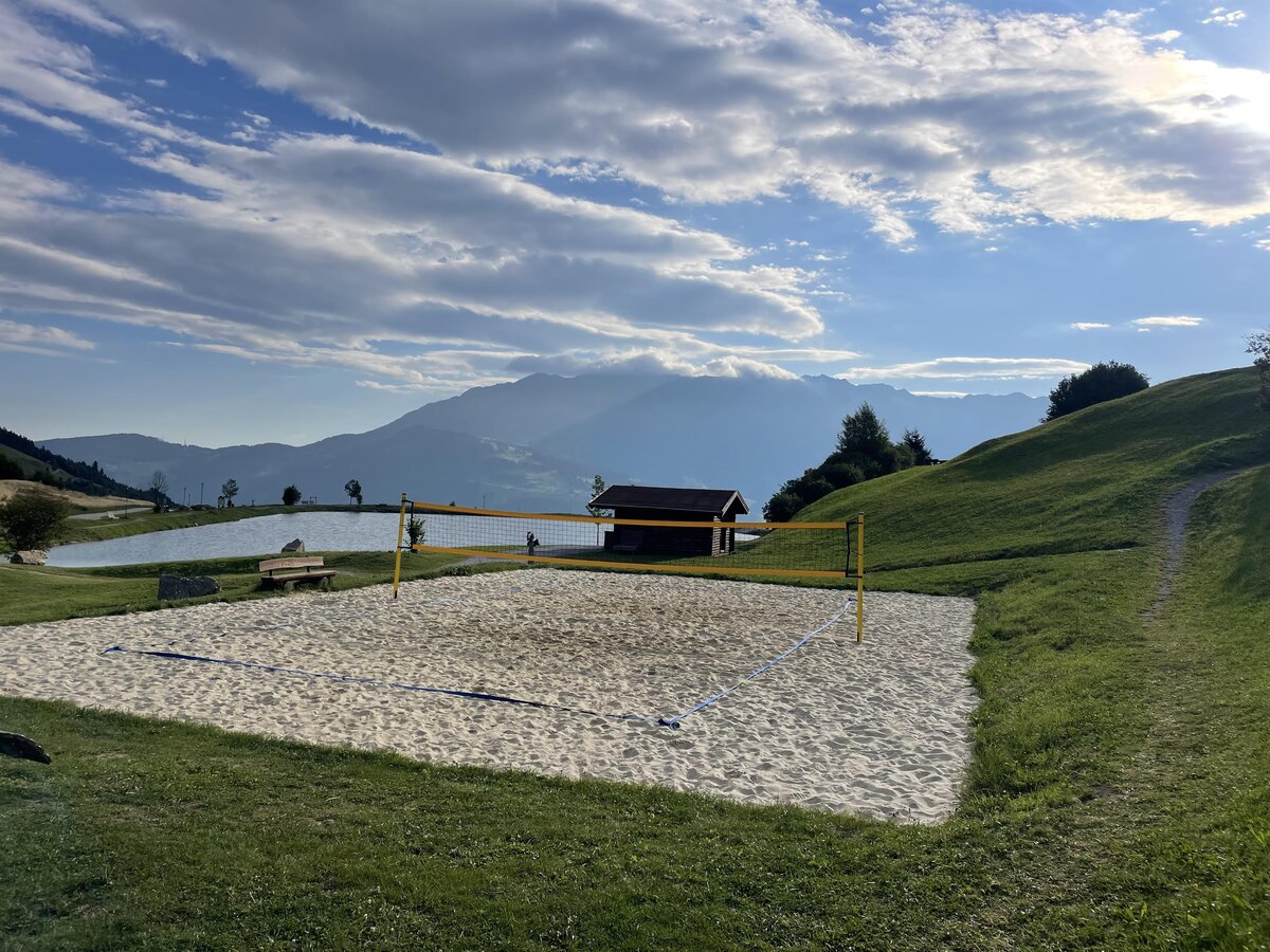 Around Wolfsee lake, a reservoir pond in a magnificent location in Fiss, a walking and relaxation trail for the whole family was created. The circular hiking trail leads you through gently hilly landscape and is a feast for the eyes. The trail features a mix of broad-leaved forests, larch forests and colourful pastures. Admire the diverse flora and let your eyes wander over the impressive mountain peaks reflecting on the crystal clear water of the lake. The whole trail is suitable for buggies and safely accessible for wheelchair users. Our beach volleyball court offers the ideal opportunity for all beach volleyball enthusiasts to duel in matches or to simply have fun with the family. You can find various small relaxation spots to recharge your batteries and even hire a sun umbrella. Just insert €1 or 50 cents and collect the sun umbrella.