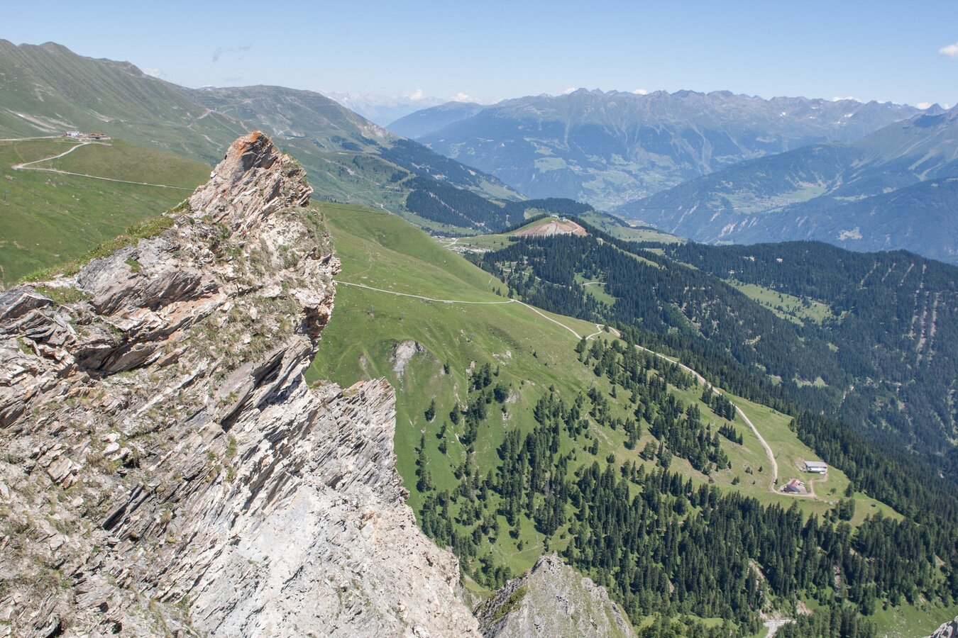 From the Komperdell top station (S104) to the Kölner Haus (S103). From there to the Lausbachbrücke bridge, past the Cervosa Alm. Descent on a vehicle track to the Lazidkreuz (S280). Further on trail no. 30, past the Böderhütte (S286) to the signpost (S290). Via serpentines steeply upwards to the Riefenjoch (S287). From here in 30 minutes you reach the summit of the Hinteren Heuberg (S295). From the Riefenjoch (S287) you reach the Pezidsattel (S292) and the Pezidbahn mountain terminal (closed in summer) – but only via the Riefenkopf and via a brittle-stone ridge suitable only for experienced hikers. Behind the mountain terminal is a trail to the main summit of the Pezid (2,770 m). Descent on the vehicle track, from the signpost (S227) onto the trail to the crossing (S223) and on trail no. 26 to Scheid (S217) and further on to the Lazidbahn mountain terminal (S301).